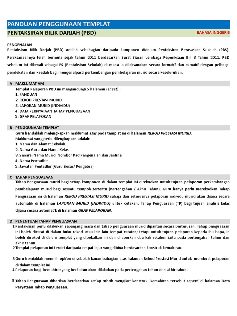 PBD dapat membantu guru dalam. PANDUAN PELAKSANAAN PENTAKSIRAN BILIK DARJAH Edisi ke-2. 35 Templat Pelaporan PBD Tahun 4 5 6 dan Tingkatan 1 2 3 Templat pelaporan ini disediakan dalam fail Microsoft Excel dan digunakan oleh guru secara luar talian.